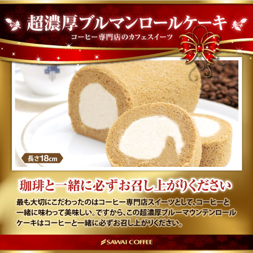 超濃厚ブルーマウンテンロールケーキはコーヒーの豊かな薫りで甘さを控えた大人の味わいのロールケーキで、 コーヒーと一緒に味わっていただきたい一品です。