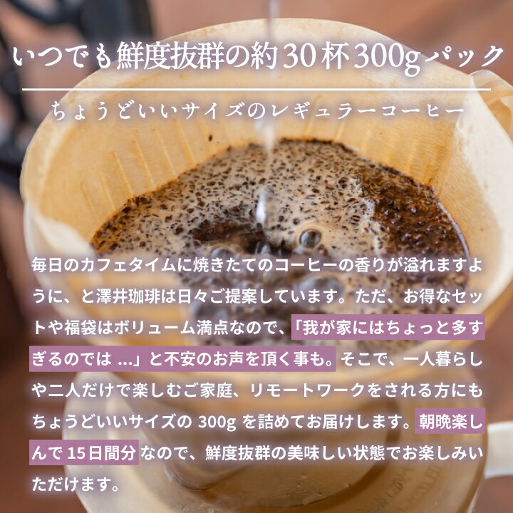 | こんな方にオススメです | 1. 本格的なコーヒーを家庭で楽しみたい人 エチオピア産の厳選された豆を使用しており、自宅で簡単に澤井珈琲の40年以上の歴史が支える品質の本格的な味わいを楽しめます。 手軽に飲めるのに質が高いので、コーヒー好きな方におすすめです。また、100g×2袋で新鮮な状態を保ちやすいちょうどいいサイズなので、大容量のコーヒーが必要ない方にも最適です。 一人暮らしや二人暮らしのご家庭でも、新鮮な状態で最後まで美味しく飲みきれます。 2. リモートワークや在宅勤務中にリフレッシュしたい人 自宅での仕事が多い方におすすめです。淹れたてのコーヒーの香りで、気分転換や集中力アップをサポートします。手軽に20杯分楽しめるので、無理なく毎日続けられます。 |
