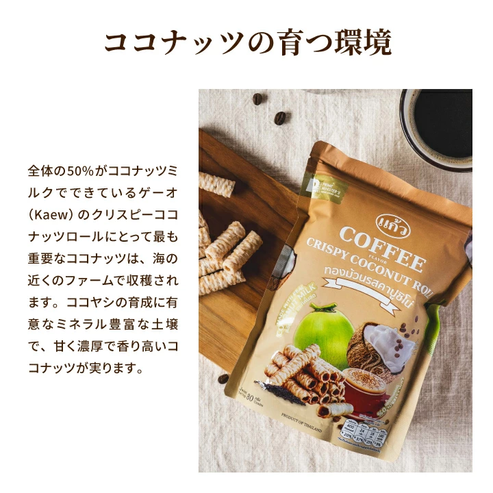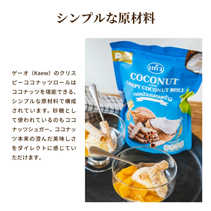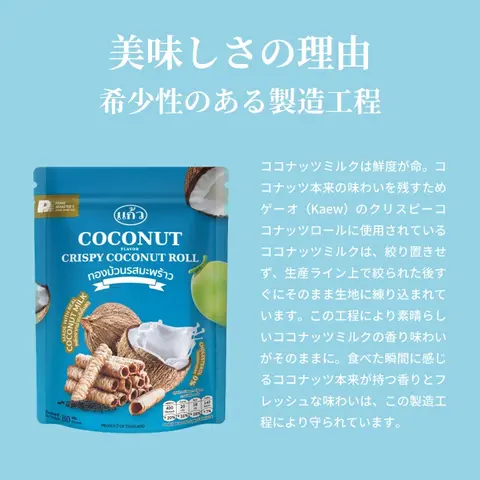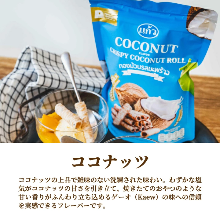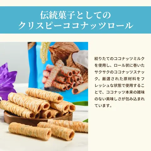 香ばしいココナッツミルクをたっぷり使い、サクッと軽やかな食感に焼き上げたタイの伝統菓子「クリスピーココナッツロール」。素材の自然な甘みと優しい香りがふんわり広がり、コーヒーにもぴったりのトロピカルスイーツです。