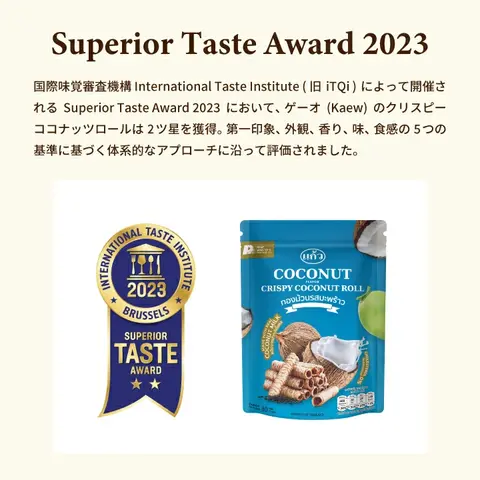 国際味覚審査機構「Superior Taste Award 2023」で2ツ星を獲得し、タイ政府の「Prime Minister’s Export Award 2020」でも表彰された品質。砂糖にはココナッツシュガーを使用し、化学的な添加物は使わずに仕上げています。素材の味をいかした自然な甘さと香ばしさは、安心して毎日のおやつに楽しめる一品です。