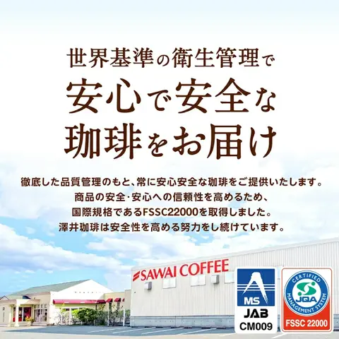 澤井珈琲(さわいこーひー)では、お客様のお家に商品が届き、箱を開けた瞬間。そして、トレードマークの赤いコーヒー袋の封を開けた時に鮮度抜群の「香り高さ」と、飲んだときの「味わい」に感動して頂けるように、レギュラーコーヒーはご注文を頂いてから焙煎をして焼きたてのコーヒー、コーヒー豆、珈琲、珈琲豆をお届けをしている焼き立て珈琲専門店です。お客様に「美味しい」と言って喜んで頂く事が私たちの喜びと思ってます。「美味しいコーヒーをお届けしたい」と想い続けて生まれたこだわりの味を、どうぞ、この機会にお楽しみくださいませ。澤井珈琲では、コーヒー豆は挽き方がご選択いただけます。珈琲豆を挽く事をお楽しみ頂ける『豆のまま』や、私共の専用の特注サイズの大型のミルで挽いて、コーヒー粉の状態にしてお届けする方法がございます。中挽き、細挽き、粗挽き、荒挽きなど様々な挽き方がございますが、私共がお薦めする『店長のおすすめ挽き』にて、そのコーヒーに合った一番美味しいと思える挽き方に挽いてお届けします。東京の銀座にも実店舗を構え、都内では浅草やスカイツリーのあるソラマチにも出店。「鳥取のコーヒー屋さん」とも呼ばれてますが、空気が綺麗で自然豊かな鳥取県に焙煎工場を構え、隣接する島根県の松江市や出雲市にも実店舗がございます。顔の見えないネット通販ですが、全国11店舗を展開する安心安全な澤井珈琲は、特徴的な「赤いコーヒー袋」に入れて、全国の珈琲好きにお選び頂いてます。よく間違えられる名前として、沢井珈琲、沢井コーヒー、澤井珈琲店、澤井珈琲本店、さわいこーひー、サワイコーヒーなどがございますが、正式名称は澤井珈琲となります。