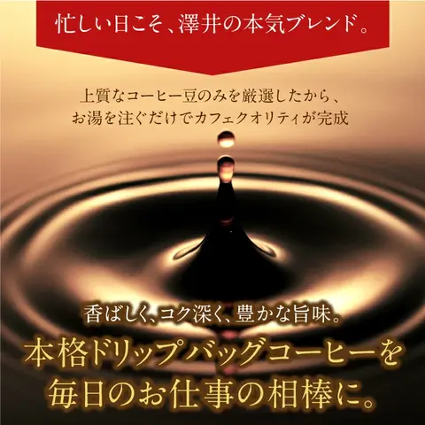 深煎りの香ばしさと豊かなコクを楽しめる、澤井珈琲のドリップバッグ「ビジネスブレンド」。ブラジル・コロンビア・インドネシア産の高級豆を使用し、香り高く濃厚な味わいを実現しました。忙しい朝も、オフィスでも、自宅でも、手軽に淹れたての美味しさと香りを楽しめる一杯です。一日の始まりや仕事の合間に、ほっと心を癒す時間を届けてくれます。