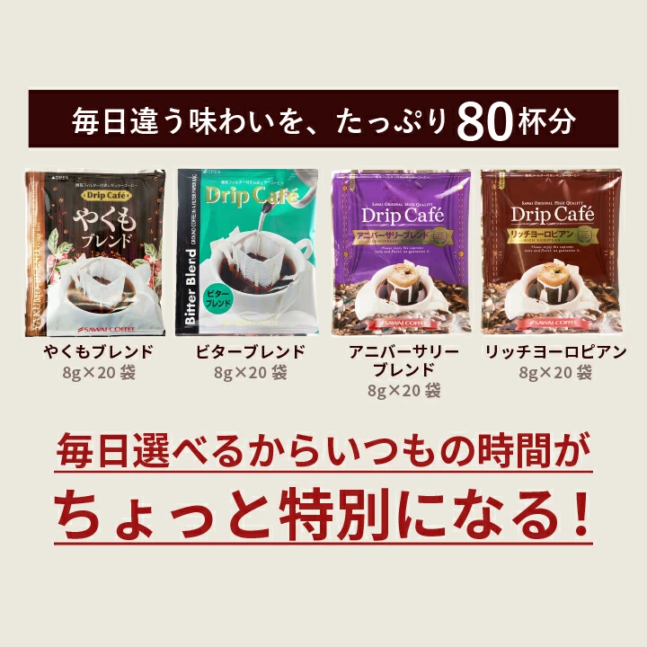 送料無料 ドリップバッグ コーヒー 珈琲 "毎日ご褒美◎人気の4種を贅沢飲み比べドリップパック" 澤井珈琲 ドリップコーヒー 80袋 やくも・ビターブレンド・アニバーサリー・リッチヨーロピアン 濃厚なコク ビター リラックス
