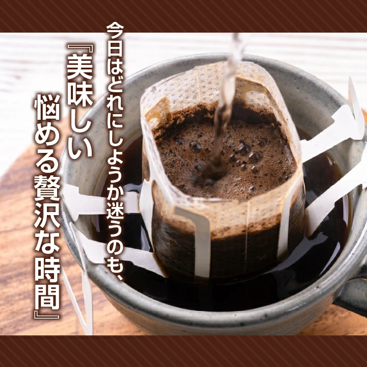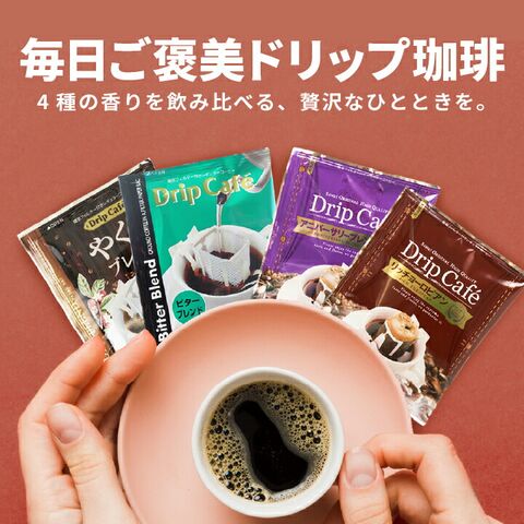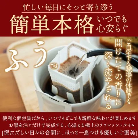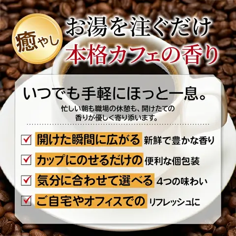 お湯を注ぐだけで香り高い本格コーヒーが完成。忙しい朝も、ほっと一息つきたい午後も、4つの味わいがあなたの時間を彩ります。