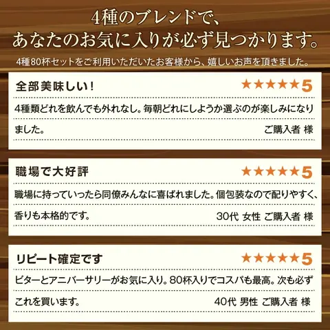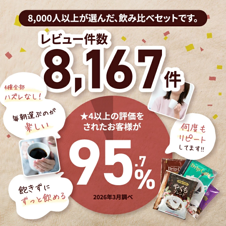 レビュー8,167件、評価95.7%の実績。毎朝選ぶのが楽しい4種の味わいを、何度もリピートされるお客様の声が証明しています。