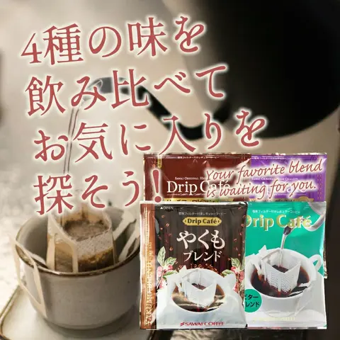 | こんな方にオススメです | 1. 飲み比べするために購入 やくもブレンド・ビターブレンド・アニバーサリーブレンド・リッチヨーロピアンと当店の人気ドリップ4種がセットになっているため、飲み比べをするために購入される方もおられます。お好みの味を見つけて頂けます。 2. 職場でのリフレッシュタイム用に購入 多くの方が職場での休憩時間にこのコーヒーを楽しんでいます。個包装で持ち運びが便利なので、オフィスでも新鮮なコーヒーを手軽に楽しむことができます。仕事の合間にリフレッシュしたい方におすすめです。 3. コストパフォーマンスを重視して購入 このコーヒーは、価格と品質のバランスが良いと多くの方が評価しています。経済的に優れているため、たくさん飲む方でも安心して購入できます。コスパを重視する方には最適です。 |