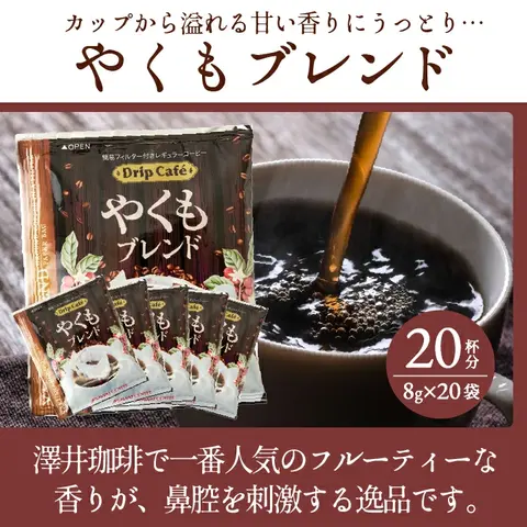 | 内容量 | ●ドリップバッグ(1袋8g) 4種×20個 ・やくもブレンド ・ビターブレンド ・アニバーサリーブレンド ・リッチヨーロピアン |