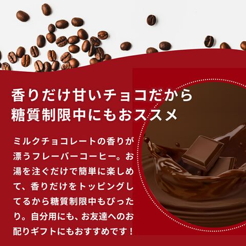 | この「ミルクチョコレートフレーバーコーヒー」は、甘いチョコレートの香りを楽しみながら、糖質制限中でも安心して飲める特別なコーヒーです。手軽にお湯を注ぐだけで、深いコクと甘い香りが広がり、日常のリラックスタイムにぴったり。自分へのご褒美や贈り物としても最適な一品です。