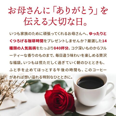 | こんな方にオススメです | 珈琲が大好きなお母さんに:14種類ものバラエティ豊かな味わいが入っているので、コーヒー好きな方にとって毎日が新鮮な楽しみに変わります。 家族みんなで珈琲を楽しむご家庭に:たっぷり840杯分のドリップバッグ入りだから、家族でシェアして飲むのにもぴったり。 普段なかなか感謝を伝えられない方に:感謝カードとカーネーションがセットになっているから、言葉にするのが苦手な方でも「ありがとう」をしっかり伝えられます。 |