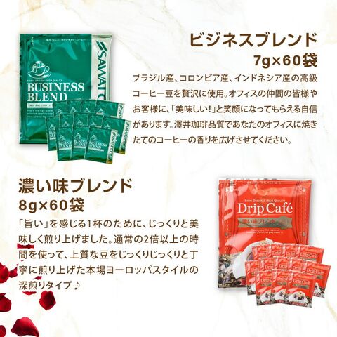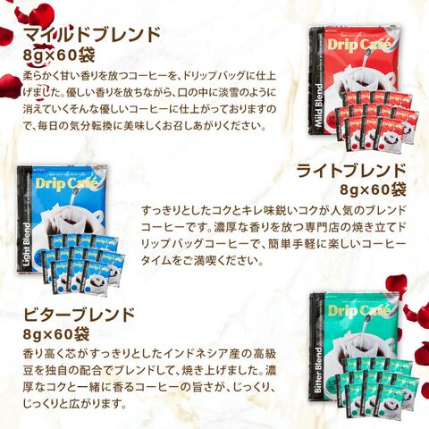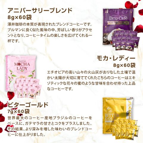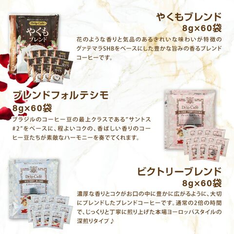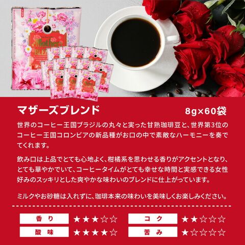 | 内容量 | ●ドリップバッグ ・マザーズブレンド 8g×60袋 ・マイルドブレンド 8g×60袋 ・ライトブレンド 8g×60袋 ・ビターブレンド 8g×60袋 ・やくもブレンド 8g×60袋 ・ブレンドフォルテシモ 8g×60袋 ・ビクトリーブレンド 8g×60袋 ・アニバーサリーブレンド 8g×60袋 ・モカ・レディ 8g×60袋 ・ビターゴールド 7g×60袋 ・ハウスブレンド 7g×60袋 ・オフィスブレンド 7g×60袋 ・ビジネスブレンド 7g×60袋 ・濃い味ブレンド 8g×60袋 ●カーネーション1本 ●感謝カード1枚 |