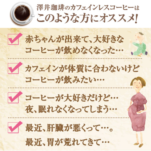 | こんな方にオススメです | 寝る前に飲みたい方にオススメ 多くのお客様が夜にカフェインを摂りたくないために購入しています。カフェインが入っていないので、夜でも安心して美味しいコーヒーを楽しめます。 妊娠中や授乳中の方にオススメ 妊娠中や授乳中でもコーヒーを楽しみたい方に人気です。カフェインを気にせず美味しいコーヒーを飲めるので、リラックスタイムにぴったりです。 健康を気にする方にオススメ カフェインが体に合わない方や健康のためにカフェイン摂取を控えたい方に選ばれています。カフェインレスでも美味しいコーヒーが楽しめます。 |