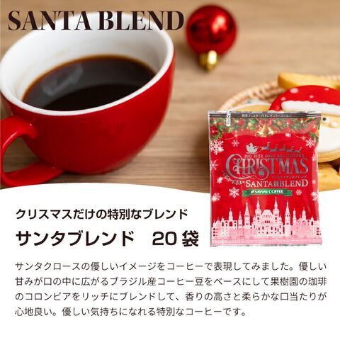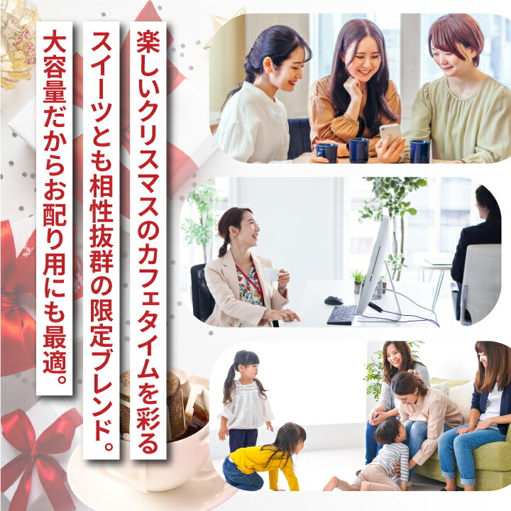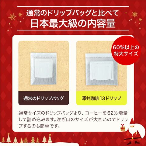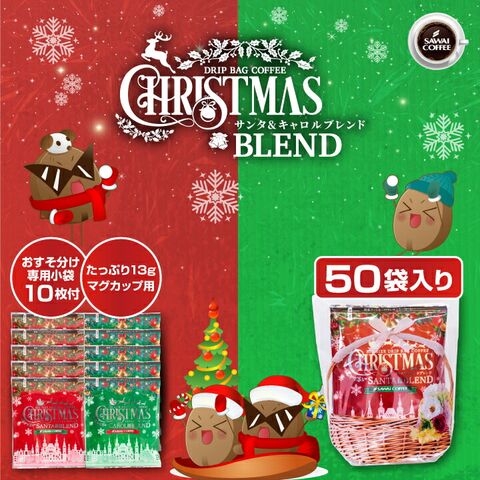 たっぷり13gの大容量ドリップコーヒーが50袋入り!クリスマス限定の香り豊かな2種のブレンドで、心温まる冬のカフェタイムを楽しめます。ギフトにもぴったり!