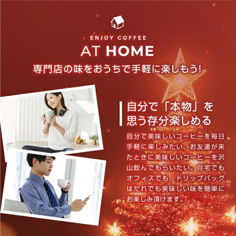 1.大容量で満足感たっぷりの特別なクリスマスブレンド クリスマス限定でしか味わえない「サンタブレンド」と「キャロルブレンド」が入った大容量セットです。それぞれたっぷり13g入りで、通常のドリップバッグよりも60%以上の大容量。深みのあるサンタブレンドは少しビターでスイーツとの相性が抜群。甘く香るキャロルブレンドは、キャラメルの風味がやさしく広がり、飽きのこない味わいです。ブラックでもミルクを入れても美味しく、大人から子どもまで家族みんなで楽しめます。 2.ギフトやおすそ分けに便利な小袋とシール付き このセットには「おすそ分け専用小袋」が10枚も付属。透明シールもセットになっているので、袋の口をとめるだけで簡単にミニギフトが作れます。パーティーやちょっとしたお礼、お配り用にも便利。さらに、お菓子を一緒に入れれば、あなただけのオリジナルプチギフトも作れます。見た目もかわいく、贈る相手にもきっと喜ばれます。 3.ドリップバッグだから、誰でも簡単&時短カフェタイム 香りを逃さない個包装タイプで、アロマをしっかり閉じ込めた製法により長持ち。お湯を注ぐだけで、たった3分で本格的なコーヒーが楽しめます。自宅でもオフィスでも、忙しい朝や仕事の合間の休憩時間にもぴったり。注ぎ口も広くて使いやすく、インスタントとは比べ物にならない香りと味わいを、手軽にお楽しみいただけます。 |