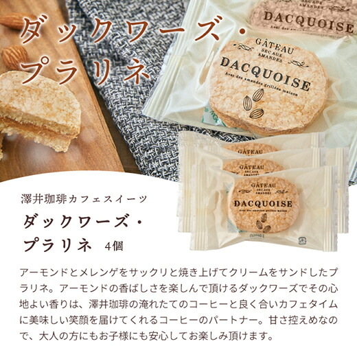 | 内容量 | ・ダックワーズ プラリネ×4個 ・ダックワーズ ショコラ×4個 ・ドリップバッグ マイルドブレンド 8g×3袋 ・ドリップバッグ ビターブレンド 8g×3袋 |