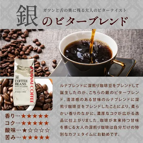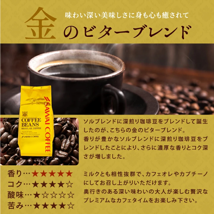 | 産地 | 【金のビターブレンド/銀のビターブレンド】ブラジル、エチオピア他 【銅のビターブレンド】ブラジル、ベトナム、エチオピア他 |