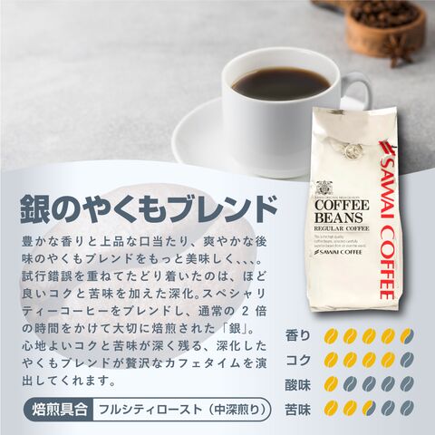 | こんな方にオススメです | 飲み比べを楽しみたい方へ:金、銀、銅の3種類の味わいが飲み比べができますので毎日のコーヒータイムをバラエティ豊かに楽しみたい方に最適です。 新鮮なコーヒーが好きな方: 澤井珈琲は焼きたてコーヒー専門店だから、いつでも新鮮な味を楽しめます。 家族やオフィスで飲む方: 大容量のパッケージなので、みんなで楽しめます。 |
