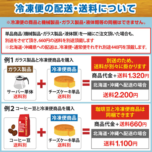北海道・沖縄県への配送は、冷凍便・通常便それぞれ別途400円(税別)を頂戴します。