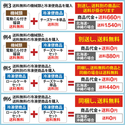 例4:電動ミル付き福袋(送料込)+チーズケーキセット(送料込)=商品代金+送料800円(税抜)