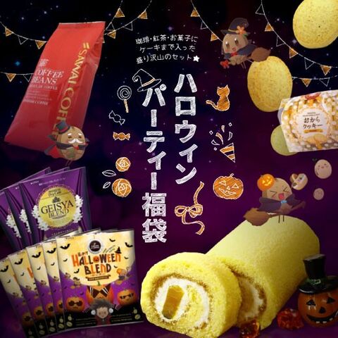送料無料 ハロウィンパーティー福袋(かぼちゃのロールケーキ/パンプキン/コーヒー豆/珈琲豆/おからクッキー/スイーツ/紅茶/ティーバッグ/ハロウィンブレンド)