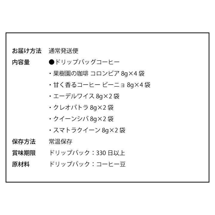 | 内容量 | ・果樹園の珈琲コロンビア ×4袋 ・甘く香るコーヒー ビーニョ ×4袋 ・エーデルワイス ×2袋 ・クレオパトラ ×2袋 ・クイーンシバ ×2袋 ・スマトラクイーン ×2袋 |