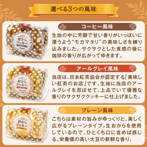 | こんな方にオススメです | 1. 健康を意識したおやつが欲しい方に このクッキーはおからを100%使用しており、低カロリーで栄養満点なので、ダイエットや健康を意識した方にぴったりです。おやつタイムにも罪悪感なく楽しめます。 2. コーヒータイムのお供を探している方に コーヒー専門店が作ったこのクッキーは、特にコーヒーと相性抜群です。お客様の多くが、コーヒーと一緒に楽しむために購入しており、豊かな香りと味わいが広がります。 3. 手作りの温かみが感じられるスイーツを求めている方に 機械で大量生産されていない、1個1個手作りのクッキーは、心温まる贈り物にも最適です。パティシエが愛情を込めて作っているので、その温かみが感じられます。 4. ギフトやおもたせとして選ぶ方に 個包装されているので、ギフトやおもたせとしても喜ばれます。おしゃれな見た目と選べる3つのフレーバーで、贈り物としての購入が多い商品です。 5. 食感にこだわる方に 「サクサク」と「ほろっとした」独特の食感が魅力です。パサつかず、柔らかいのに食べごたえがあると、多くの方がその食感を楽しみに購入しています。 |