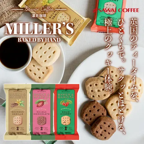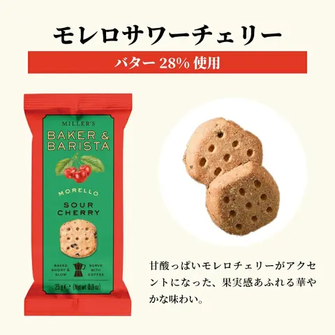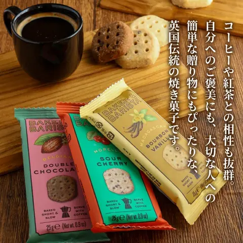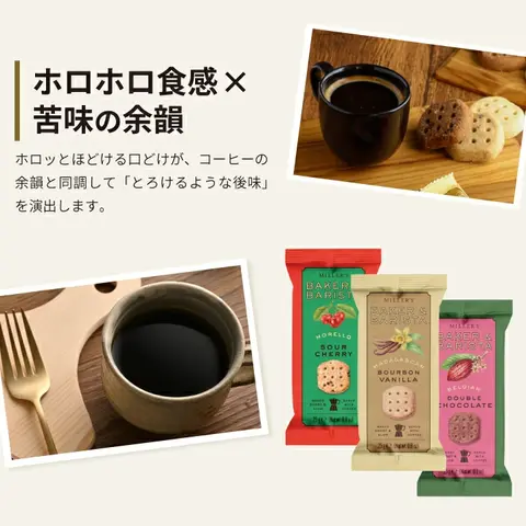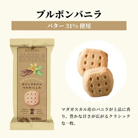 | 英国の伝統製法で作られた本格派ビスケット「MILLER’S BAKER & BARISTA」は、米粉とたっぷりのバターを使用した軽やかでホロホロとほどける食感が特長です。マダガスカル産バニラの香る「ブルボンバニラ」、濃厚なカカオの「ベルジャンダブルチョコ」、果実感あふれる「モレロサワーチェリー」の3種を展開。コーヒーや紅茶との相性も抜群で、自分へのご褒美やちょっとしたギフトにもぴったりな上品な焼き菓子です。 1. 英国伝統の製法が生む、本格派クッキーの上品な味わい 「MILLER’S BAKER & BARISTA」は、英国の伝統的な焼き菓子製法を受け継ぐ本格派ブランド。米粉とバターをたっぷり使った生地は、サクサクと軽やかで口の中でほろりとほどける繊細な食感。素材の良さが際立ち、シンプルながら奥深い味わいを楽しめます。一口食べるたびに感じる香ばしさと優しい甘みが、上質なティータイムを演出します。 2. 3つの個性が光るフレーバーで、気分に合わせて楽しめる マダガスカル産バニラの豊かな香りが広がる「ブルボンバニラ」、ベルギー産チョコチップの濃厚なコクが魅力の「ベルジャンダブルチョコ」、果実感あふれる華やかな「モレロサワーチェリー」どの味も素材の持ち味を丁寧に引き出しています。その日の気分や飲み物に合わせて、お好みの一枚を選んで楽しめる焼き菓子です。 3. コーヒーや紅茶と調和する、上質なひとときを演出 バターのコクとコーヒーのほろ苦さが引き立て合い、ホロホロとした口どけが飲み物の余韻と調和する絶妙なバランス。米粉のやさしい軽さが後味をすっきり整え、どんなドリンクとも相性抜群です。自分へのご褒美にはもちろん、大切な人への贈り物としても喜ばれる、上品で洗練された英国焼き菓子です。 |