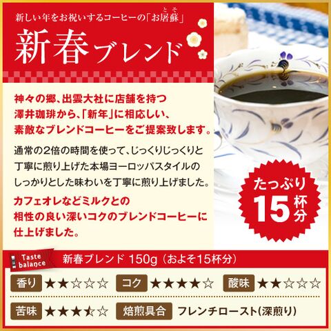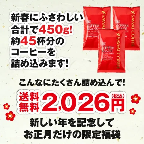| お正月をもっと楽しく!縁起の良いコーヒー3種が入った新年限定の福袋。3つの縁起の良いコーヒー「新春ブレンド」「初夢ブレンド」「干支ブレンド」が合計450g入っており、1年の始まりにふさわしい美味しさが楽しめます。送料無料でお得に新春を迎えられる福袋です。