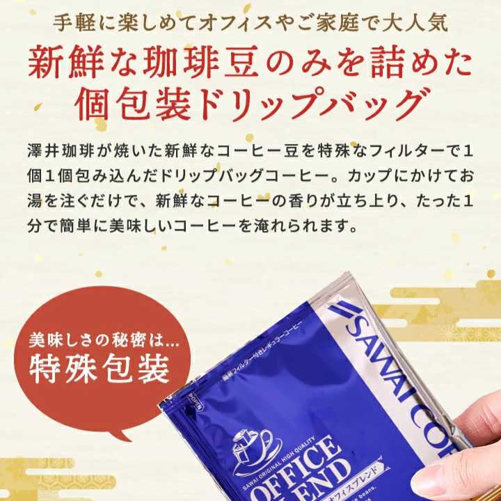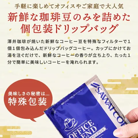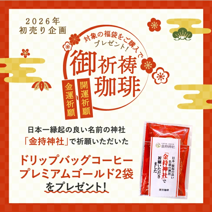 | お正月限定で販売されるこちらの福袋は、金持神社で祈願された縁起の良いコーヒーが入った特別セットです。深煎りの香ばしい3種のブレンドが30袋と、祈願付きのプレミアムゴールド2袋入りで、新しい年を美味しく幸せに迎えられます。 1.新年を祝う特別な福袋 2026年の午年を記念して作られた限定ドリップバッグコーヒー福袋です。金持神社で祈願された「御祈祷珈琲」が付いており、新しい年に幸運を呼び込む縁起の良いコーヒーセット。ハウスブレンド・オフィスブレンド・ビジネスブレンドの3種類をたっぷり30袋、さらに金運祈願のプレミアムゴールド2袋をプレゼント。送料無料でお届けします。 2.深煎りの香ばしさが楽しめる3種のブレンド 人気の3種類のブレンドを詰め合わせました。ハウスブレンドはリラックス時間にぴったりの甘い香りとほろ苦さ。オフィスブレンドは来客にも出せる上品な深煎りで、コクと旨みがたっぷり。ビジネスブレンドは高級豆を使い、仕事の合間に気分を上げてくれるしっかりとした味わいです。どれも深煎りタイプで、香り高く飲みごたえのある一杯を楽しめます。 3.個包装&特殊パックでいつでも新鮮 澤井珈琲のこだわりが詰まったドリップバッグは、1杯ずつ窒素充填された個包装タイプ。開けた瞬間に広がる香ばしい香りを長く保ちます。カップにセットしてお湯を注ぐだけで、本格的な味と香りを手軽に味わえます。ご家庭でもオフィスでも、贅沢なコーヒータイムを楽しめます。 | |