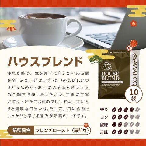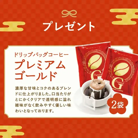 | こんな方にオススメです | 新年を特別な気分で迎えたい方:お正月限定の福袋で、金持神社で祈願された縁起の良いコーヒーが入っています。新しい年を幸運な気持ちでスタートしたい方にぴったりです。 深煎りのコーヒーが好きな方:3種類の深煎りブレンドが入っていて、香ばしさやコクの違いを飲み比べできます。苦味が好きな方や、しっかりとした味わいを求める方におすすめです。 手軽においしいコーヒーを楽しみたい方:ドリップバッグタイプだから、お湯を注ぐだけで本格的な味わい。忙しい朝やお仕事の合間でも、簡単においしいコーヒーを楽しめます。 |