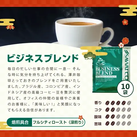 | 内容量 | ドリップバッグコーヒー ・ハウスブレンド 7g×10袋 ・オフィスブレンド 7g×10袋 ・ビジネスブレンド 7g×10袋 ・プレミアムゴールド 8g×2袋 |