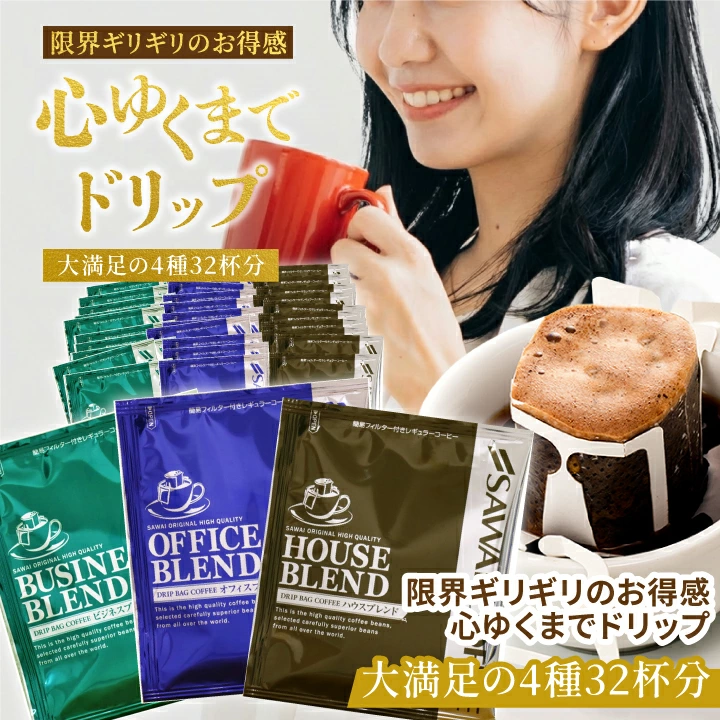 ドリップバッグコーヒー ・ハウスブレンド 7g×10袋 ・オフィスブレンド 7g×10袋 ・ビジネスブレンド 7g×10袋 ・プレミアムゴールド 8g×2袋 |