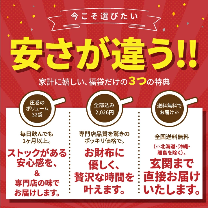毎日飲んでも1ヶ月以上楽しめる、たっぷり32袋入り。専門店品質なのにポッキリ価格で、ご自宅用にもオフィス用にも最適。全国送料無料でお届けします。