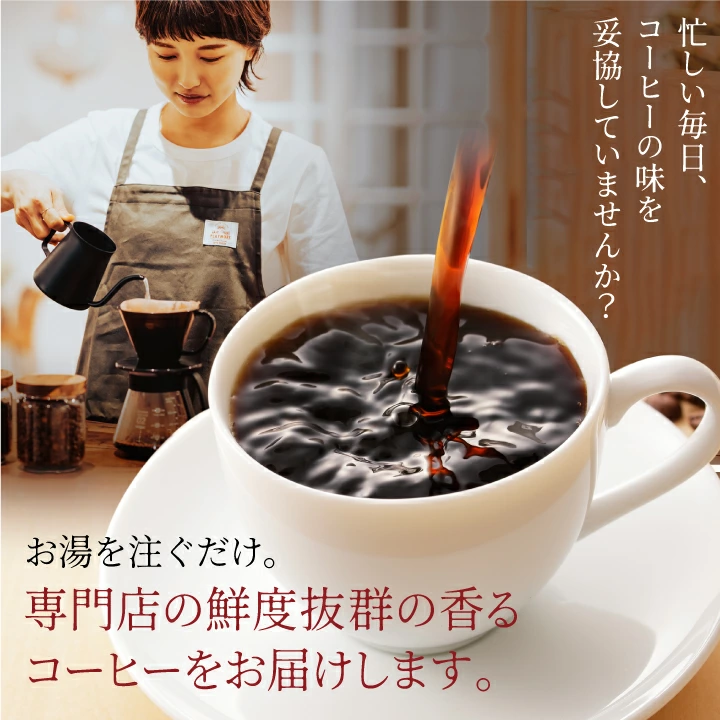 カップにセットしてお湯を注ぐだけ。3種類の香ばしい深煎りブレンドを、いつでも手軽にお楽しみいただけます。忙しい朝やオフィスでも本格的な味わいを。