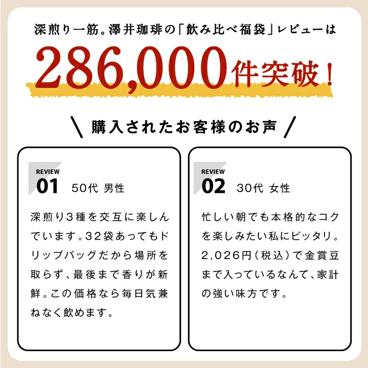 286,000件超のレビューが証明する、信頼の味と香り。深煎り好きを唸らせるブレンドをご自宅で存分にお楽しみください。