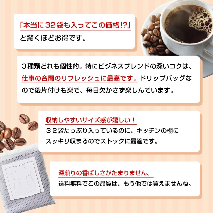 香ばしい深煎り3種の飲み比べセット。個包装だから鮮度そのまま、お湯を注ぐだけで本格的な味わいが楽しめます。たっぷり32袋入りで毎日の贅沢に。