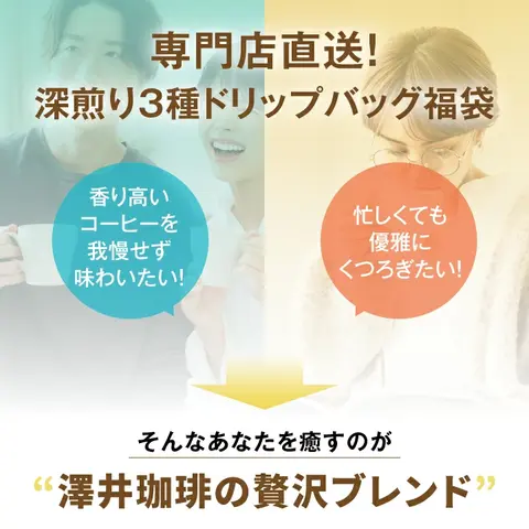 1. 深煎り3種を楽しめる飲み比べ福袋 人気の深煎りブレンドを飲み比べできるセットです。香ばしさ、コク、ほろ苦さの違いを楽しみながら、毎日のコーヒータイムを豊かにします。大容量32袋入りで、まとめ買いにも便利です。 2. 個包装でいつでも新鮮な香り 1杯ずつ窒素充填された個包装タイプ。開封した瞬間に広がる香りと、淹れたての味わいを手軽に楽しめます。カップにセットしてお湯を注ぐだけで、本格ドリップコーヒーが完成します。 3. 自宅用にもギフトにも使える福袋 大容量でコストパフォーマンスに優れた福袋仕様。自宅で毎日飲むコーヒーとしてはもちろん、誕生日プレゼント、内祝い、お礼、法人ギフトなどにも選ばれています。 |