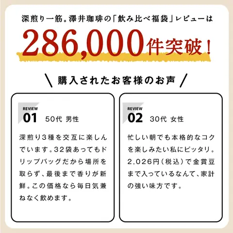 深煎りの香ばしさを3種類で飲み比べ。たっぷり32袋入りで、毎日の一杯が楽しみになるお財布にやさしい福袋セットです。