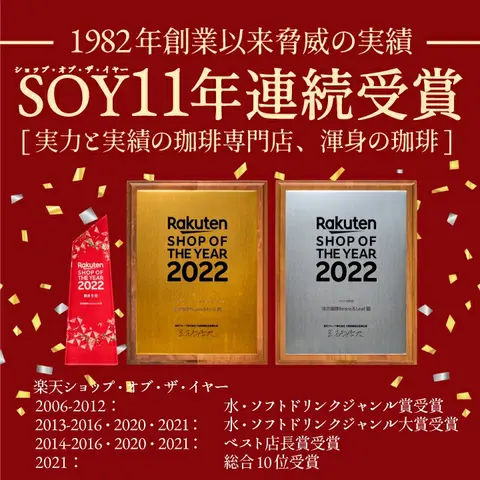 1982年創業以来の確かな実績。楽天SOY11年連続受賞の信頼できる珈琲専門店だから、安心してお選びいただけます。