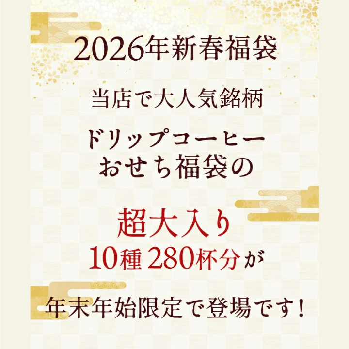 | こんな方にオススメです | 1. 来客用やお正月の準備に 年末年始は来客が多くなりますが、280杯分の大容量セットなら安心です。お湯を注ぐだけで手軽に美味しいコーヒーを出せるので、おもてなしに最適です。 また、個包装されているので、職場やオフィスでシェアするのに便利。忙しい仕事の合間に手軽に美味しいコーヒーを飲むことが出来ます。 2. コーヒー好きな人への贈り物 年末年始はギフトシーズンでもあります。そんな時に、この「おせち福袋」はコーヒー好きな方へのプレゼントとしても最適です。10種類ものブレンドがセットになっているため、飲み比べの楽しさや新しい味の発見もあります。「お得感」と「特別感」が詰まったこの福袋は、贈る相手に喜ばれること間違いなし。個包装で保管しやすく、どこでも簡単に飲めるので、日常的にコーヒーを楽しむ方には特に嬉しい内容です。 |