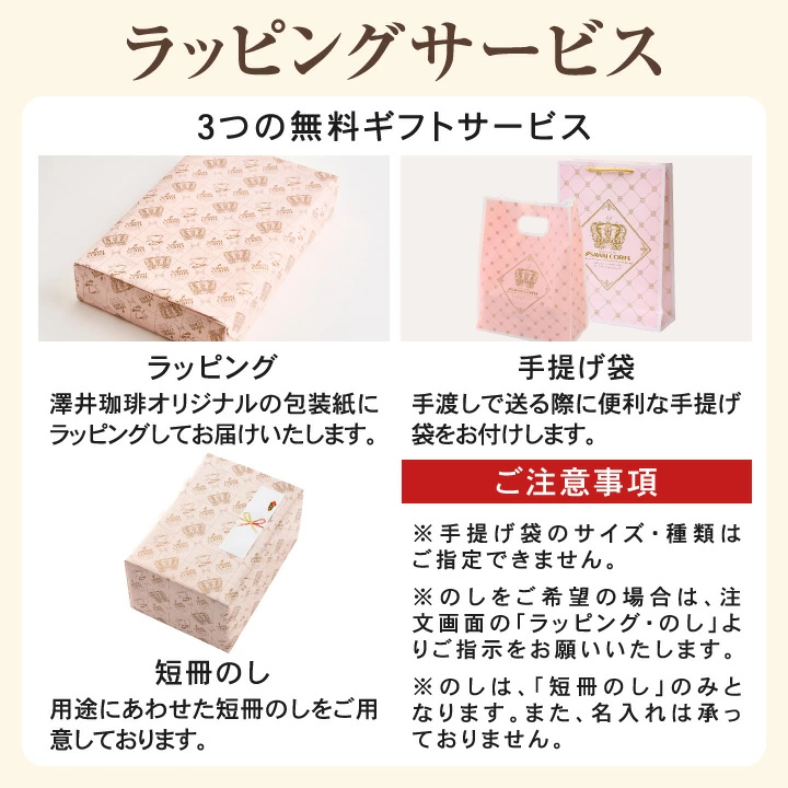 澤井珈琲(さわいこーひー)では、お客様のお家に商品が届き、箱を開けた瞬間。そして、トレードマークの赤いコーヒー袋の封を開けた時に鮮度抜群の「香り高さ」と、飲んだときの「味わい」に感動して頂けるように、レギュラーコーヒーはご注文を頂いてから焙煎をして焼きたてのコーヒー、コーヒー豆、珈琲、珈琲豆をお届けをしている焼き立て珈琲専門店です。お客様に「美味しい」と言って喜んで頂く事が私たちの喜びと思ってます。「美味しいコーヒーをお届けしたい」と想い続けて生まれたこだわりの味を、どうぞ、この機会にお楽しみくださいませ。澤井珈琲では、コーヒー豆は挽き方がご選択いただけます。珈琲豆を挽く事をお楽しみ頂ける『豆のまま』や、私共の専用の特注サイズの大型のミルで挽いて、コーヒー粉の状態にしてお届けする方法がございます。中挽き、細挽き、粗挽き、荒挽きなど様々な挽き方がございますが、私共がお薦めする『店長のおすすめ挽き』にて、そのコーヒーに合った一番美味しいと思える挽き方に挽いてお届けします。東京の銀座にも実店舗を構え、都内では浅草やスカイツリーのあるソラマチにも出店。「鳥取のコーヒー屋さん」とも呼ばれてますが、空気が綺麗で自然豊かな鳥取県に焙煎工場を構え、隣接する島根県の松江市や出雲市にも実店舗がございます。顔の見えないネット通販ですが、全国11店舗を展開する安心安全な澤井珈琲は、特徴的な「赤いコーヒー袋」に入れて、全国の珈琲好きにお選び頂いてます。よく間違えられる名前として、沢井珈琲、沢井コーヒー、澤井珈琲店、澤井珈琲本店、さわいこーひー、サワイコーヒーなどがございますが、正式名称は澤井珈琲となります。