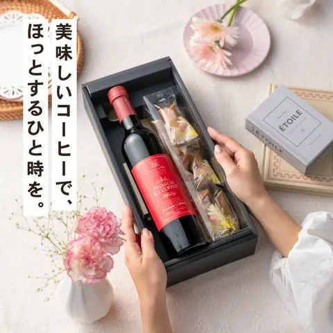 このセットは、シンプルだけど高級感のある黒いギフトボックスに入って届きます。ふたを開けると、ワインのようなコーヒーと花みたいなお菓子が並んでいて、思わず笑顔になるようなかわいさ。ちょっと特別な時間をプレゼントできます。