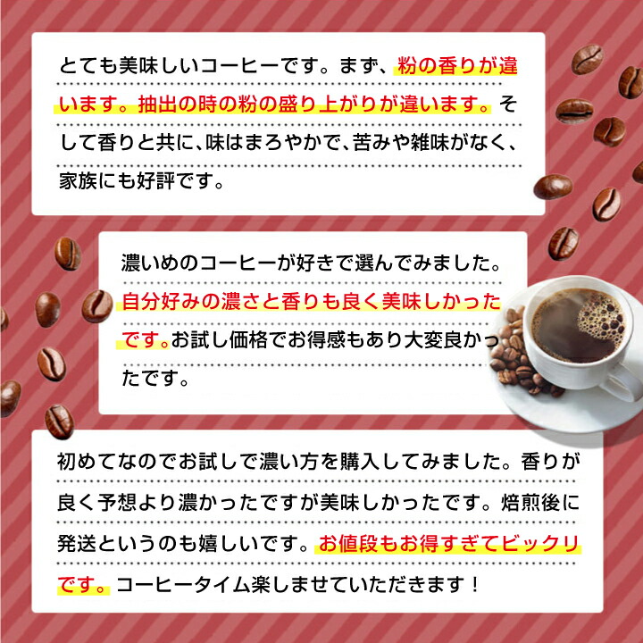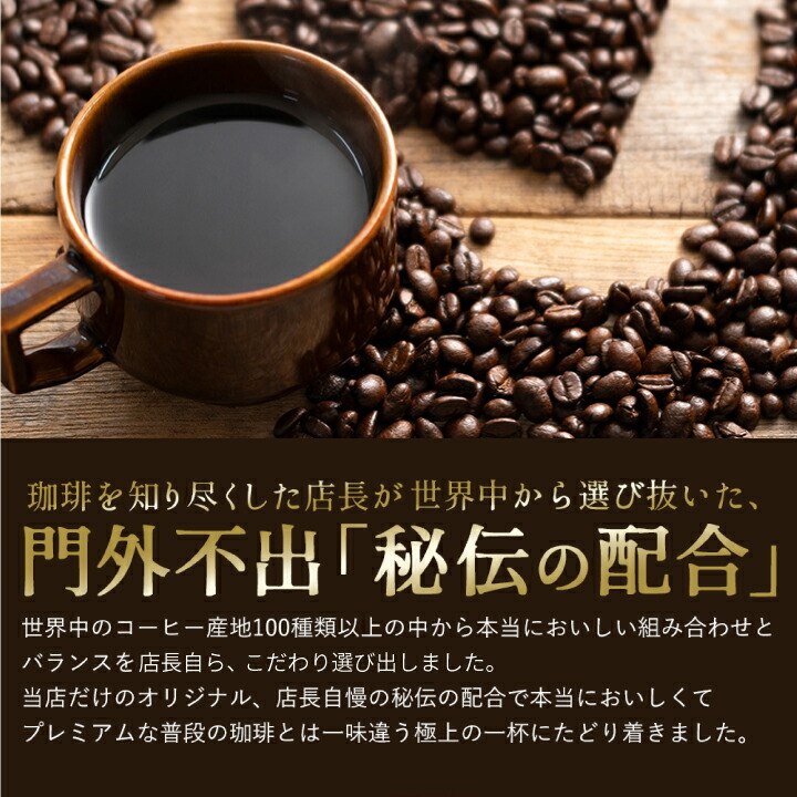 やさしい味の『プレミアムブレンド あっさり味』か、しっかり濃い『プレミアムブレンド 濃い味』が選べる、焼き立て発送のコーヒー。店長の秘伝配合を新型焙煎機で丁寧に焼き、開けた瞬間から香りが広がります。400g×4袋で約160杯分。豆のまま・中挽きも選べて、家で手軽に楽しめます。毎日の一杯がホッとする味わいです。