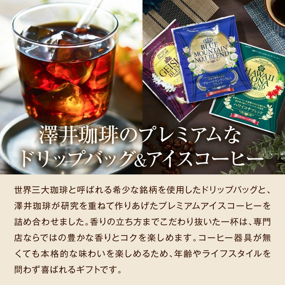 創業1982年の珈琲専門店が手がけた、ブルーマウンテンNo.1・ハワイコナ・ゲイシャをそれぞれ贅沢にブレンドしたドリップバッグと、無糖のプレミアムアイスコーヒーを詰め合わせた2段ギフト。注ぐだけで本格的な味と豊かな香りを楽しめ、特別なひとときを届ける贅沢なセットです。 1.世界に誇る銘柄を贅沢にブレンドした特別な味わい ブルーマウンテンNo.1を使ったブレンド、ハワイコナを使ったブレンド、ゲイシャを使ったブレンドの3種類を楽しめるドリップバッグセットです。それぞれの個性を生かしながら、専門店がバランスよく配合。上品な香り、やわらかな酸味、深みのあるコクなど、ブレンドだからこそ生まれる飲みやすさと奥行きがあります。お湯を注ぐだけで、専門店の味を手軽に楽しめるのも魅力です。特別な日にふさわしい、ぜいたくなコーヒー時間をお届けします。 2.冷やして注ぐだけの本格アイスコーヒー インドネシア産の希少な品種を使った、無糖のプレミアムアイスコーヒーです。リキッドタイプなので、冷やしてグラスに注ぐだけ。道具はいりません。果実のようなフルーティーな香りとやさしい甘みがあり、後味はすっきり。ワインボトルに入っているため、光や空気から守られ、香りをしっかり保ちます。忙しい日でも、手軽に本格的な味を楽しめるのがうれしいポイントです。 3.安心して贈れる品質と、長く使えるギフトボックス 保存料や着色料は使わず、厳選した良質なコーヒー豆だけを使用。国内で製造し、安全にもこだわっています。大切な方へ安心して贈れる品質です。また、上品な2段ボックスは、飲み終わったあとも小物入れや思い出の品をしまう箱として使えます。見た目の美しさだけでなく、使い続けられる実用性も魅力。お祝い・お返し・記念日など、特別な気持ちを伝える贈り物にぴったりです。 |