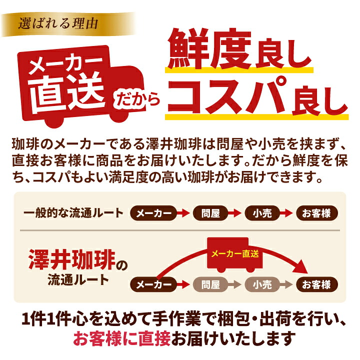 澤井珈琲(さわいこーひー)では、お客様のお家に商品が届き、箱を開けた瞬間。そして、トレードマークの赤いコーヒー袋の封を開けた時に鮮度抜群の「香り高さ」と、飲んだときの「味わい」に感動して頂けるように、レギュラーコーヒーはご注文を頂いてから焙煎をして焼きたてのコーヒー、コーヒー豆、珈琲、珈琲豆をお届けをしている焼き立て珈琲専門店です。お客様に「美味しい」と言って喜んで頂く事が私たちの喜びと思ってます。「美味しいコーヒーをお届けしたい」と想い続けて生まれたこだわりの味を、どうぞ、この機会にお楽しみくださいませ。澤井珈琲では、コーヒー豆は挽き方がご選択いただけます。珈琲豆を挽く事をお楽しみ頂ける『豆のまま』や、私共の専用の特注サイズの大型のミルで挽いて、コーヒー粉の状態にしてお届けする方法がございます。中挽き、細挽き、粗挽き、荒挽きなど様々な挽き方がございますが、私共がお薦めする『店長のおすすめ挽き』にて、そのコーヒーに合った一番美味しいと思える挽き方に挽いてお届けします。東京の銀座にも実店舗を構え、都内では浅草やスカイツリーのあるソラマチにも出店。「鳥取のコーヒー屋さん」とも呼ばれてますが、空気が綺麗で自然豊かな鳥取県に焙煎工場を構え、隣接する島根県の松江市や出雲市にも実店舗がございます。顔の見えないネット通販ですが、全国11店舗を展開する安心安全な澤井珈琲は、特徴的な「赤いコーヒー袋」に入れて、全国の珈琲好きにお選び頂いてます。よく間違えられる名前として、沢井珈琲、沢井コーヒー、澤井珈琲店、澤井珈琲本店、さわいこーひー、サワイコーヒーなどがございますが、正式名称は澤井珈琲となります。