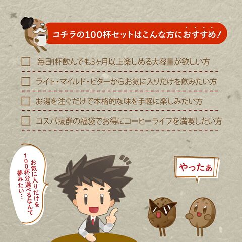 この商品は、ライトブレンド・マイルドブレンド・ビターブレンドの中からお好きな味を1種お選び頂けない100杯分の大容量福袋です。