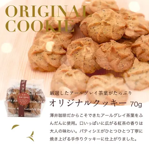 厳選されたアールグレイ茶葉をたっぷり使用したオリジナルクッキーも、このセットの魅力のひとつです。パティシエが丁寧に焼き上げたクッキーは、紅茶の香りが口いっぱいに広がり、大人の味わいを楽しむことができます。紅茶と一緒に楽しむことで、さらに充実したティータイムを過ごせます。