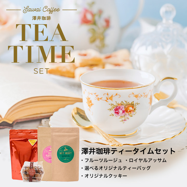 澤井珈琲のティータイムセットは、厳選された紅茶と手作りのオリジナルクッキーが楽しめるセットです。紅茶の種類が豊富で、お得に贅沢なティータイムを体験できます。
