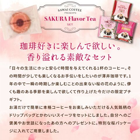 | 春を感じるさくら色の特別なプチギフトです。人気のドリップバッグコーヒー3種としっとりした焼き菓子がセットになり、自分へのご褒美や贈り物に最適。忙しい毎日に「ホッと安らぐ時間」を届けます。 1.春を感じる特別なデザイン さくらをイメージした華やかなパッケージが特徴です。このギフトセットは、季節感を演出するデザインで、贈り物としても自分用としてもぴったりです。見た目が可愛いだけでなく、開ける楽しさやもらったときの嬉しさを引き出します。 2.本格的なコーヒーの味わい 選りすぐりのドリップバッグコーヒー3種類がセットになっています。「モカレディ」は花のような香りとプラムの甘味が広がり、「モカブレンド」は優しい口当たりと甘美な香りが楽しめます。「マンデリンスイート」は濃厚なコクと苦味の後に感じる甘さが特徴です。それぞれのコーヒーが異なる風味を持ち、毎回新しい楽しさを味わえます。 3.しっとりした焼き菓子がセット ガトープルポは、じっくり焼き上げられたフィナンシェ生地が特徴です。焦がしバターの風味が絶妙で、コーヒーとの相性も抜群です。これ一つでちょっとした「ひと休み」の時間を贈ることができ、忙しい日々にリラックスを提供します。 | |