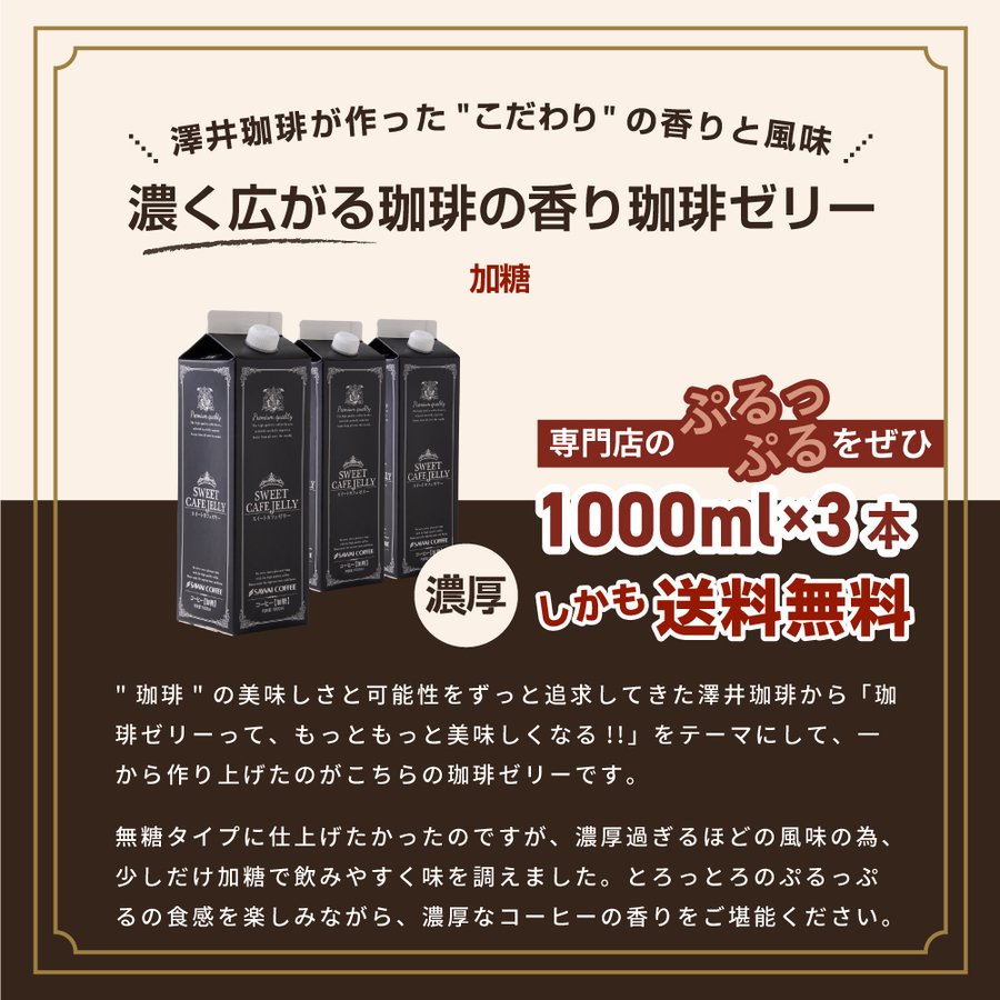| 「SWEET CAFE JELLY」は、澤井珈琲が追求した本格的な珈琲ゼリーです。芳醇な珈琲の香りと濃厚なコクが楽しめる特濃ゼリーで、贅沢な珈琲豆を使用しています。フレッシュな生クリームや牛乳と合わせて、色んなアレンジが可能です。食感を楽しむぷるぷるゼリーで、特別なひとときを演出します。 1. 濃厚な珈琲の香りとコクを堪能 この珈琲ゼリーは、特に濃い珈琲の香りとコクを楽しむことができます。贅沢な高級珈琲豆を使用し、口に入れた瞬間に広がる芳醇な香りが特別な体験を提供。珈琲好きの方はもちろん、いつものデザートを少しグレードアップしたい方にもぴったりです。夏限定のゼリーなので、今だけの美味しさをぜひ堪能してください。 2. アレンジ自由!カフェ気分を自宅で 「SWEET CAFE JELLY」は、牛乳を加えたり、生クリームやバニラアイスをトッピングすることで、まるでカフェのようなデザートに早変わり。アイスカフェオレ風にして飲むこともでき、多彩なアレンジが楽しめます。家族みんなで楽しむことができ、ホームパーティーや友達とのお茶会にも最適な一品です。 3. ぷるぷる食感がたまらない特濃ゼリー このゼリーの特徴は、なんといってもぷるぷるの食感。通常の珈琲とは違い、食べることで珈琲の味わいを楽しむ新しいスタイルのスイーツです。少し固めの食感なので、しっかりプッシュして絞り出すのがポイント。口の中で広がる濃厚な珈琲の味わいを、ゼリーという形で楽しむことができ、毎日のデザートタイムがちょっと特別なものになります。 |