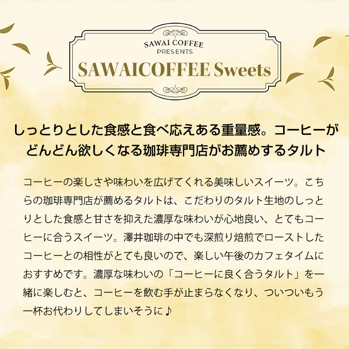 | このタルトセットは、珈琲専門店が厳選したスイーツで、コーヒーとの相性が抜群です。しっとりとした食感と、甘さ控えめの濃厚な味わいが楽しめます。特に深煎りのコーヒーと組み合わせると、最高のカフェタイムを演出します。 1. コーヒーとの相性抜群!食べ応えのあるタルト このタルトは、しっとりとしたタルト生地にこだわり、甘さを控えた濃厚な味わいが特徴です。特に澤井珈琲の深煎りコーヒーとの相性が非常に良く、午後のカフェタイムにぴったりの一品です。食べるたびにコーヒーを飲みたくなるような味わいが広がり、スイーツとコーヒーのバランスが絶妙です。濃厚なタルトの風味とコーヒーの苦みが調和し、一度食べ始めると手が止まらなくなり、ついもう一杯コーヒーをおかわりしたくなるでしょう。 2. 濃厚な味わいの「チーズタルト」 ナチュラルチーズとハチミツを使用したプレーンタイプの「チーズタルト」は、澤井珈琲の淹れたてのコーヒーと相性抜群です。タルトのしっとりとした食感と、控えめな甘さがコーヒーの美味しさを引き立て、カフェタイムに笑顔を届けます。特に甘さ控えめなので、大人だけでなくお子様にも安心してお楽しみいただけます。シンプルな美味しさが際立ち、コーヒーのパートナーとして最適な一品です。 3. バリエーション豊かなフレーバータルト このタルトセットには、オレンジ、チョコ、ナッツなどバリエーション豊かなフレーバーが揃っています。オレンジタルトはミックスジャムとオレンジスライスを使った爽やかな味わいで、中煎りから深煎りまで様々なコーヒーと良く合います。チョコタルトは深みのある味わいで、特に苦みの強いコーヒーと抜群の相性です。ナッツタルトはクルミやアーモンドの香ばしさが特徴で、優しい中煎りコーヒーと一緒に楽しむことで、カフェタイムの楽しさがさらに広がります。 |